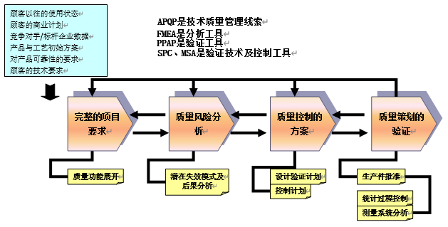 企業(yè)在“質(zhì)量是檢驗出來的”還是“質(zhì)量是制造出來的”的爭論中逐漸發(fā)現(xiàn),無論如何防范于未然才是質(zhì)量管理的終極目的,而從設(shè)計源頭的規(guī)范才是質(zhì)量預(yù)防的關(guān)鍵所在;北美三大汽車廠于是整合了工業(yè)品項目開發(fā)管理、零缺陷質(zhì)量管理與航空航天業(yè)風(fēng)險管控等諸多領(lǐng)域適用的技術(shù)質(zhì)量控制方法,提出: